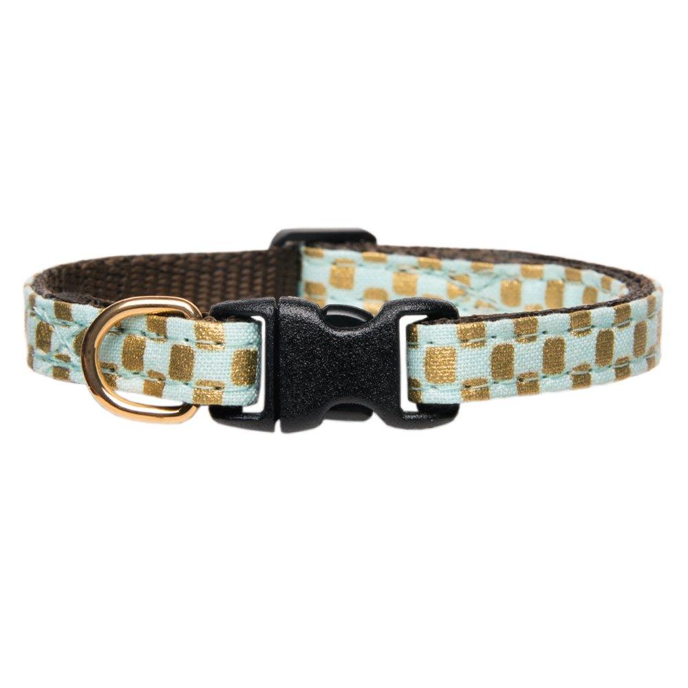 The Maverick cat collar features a beautiful metallic gold and mint checked fabric by Rifle Paper Co. The perfect look for the kitty with a love for excitement.
